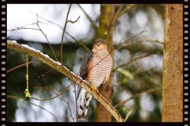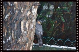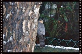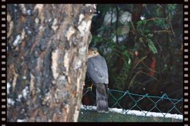 Auf jeden Fall war der Sperber jetzt schon ein paar Mal da, allerdings fliegt er im Eiltempo über den Futterplatz und dann ab auf die Tanne, wo ich ihn dann leider nicht mehr erwische. Es ist also wirklich ein Glücksumstand wenn der Kerl mal zur Fotosession bereitwillig hocken bleibt.