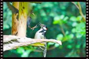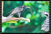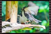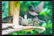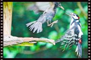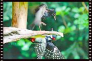 Obwohl ja in der Natur zur Zeit für alle satt zu essen vorhanden ist trifft man sich doch immer wieder gern im Futterhaus. Heute wahrscheinlich auch deshalb, weil es dort trocken ist man so ohne pitschnaß zu werden speisen kann. Aber es gibt Streit um den besten Platz. Da heute 6 Spechte gleichzeitig im Garten waren hatte es der Star echt schwer. Aber er hat Courage und wehrt sich gegen die Übermacht.