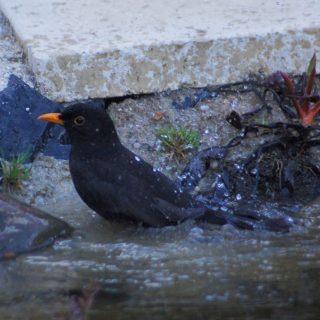 Einer Amsel sind die Temperaturen um die 0 nicht zu kalt um ein Bad zu nehmen.