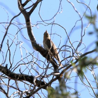 Unglaublich, dass wir einen vor die Linse bekamen. Wir folgten seinem Ruf, der uns nicht bekannt war. Die Suche ergab sich nicht einfach, obwohl er vor unseren Nasen in der schütteren Baumkrone hockte.